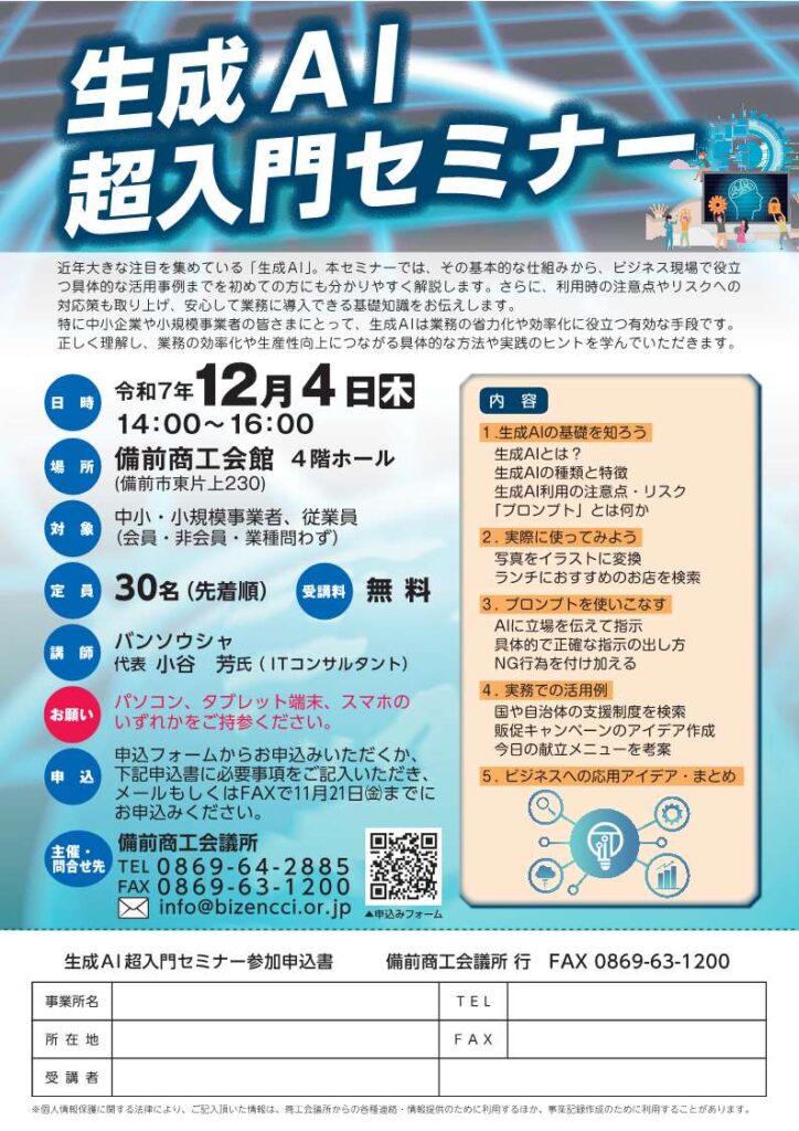 2025年12月4日にバンソウシャで行う備前商工会議所様で行うセミナー「生成AI超入門セミナー」は募集開始早々に定員となり、キャンセル待ちとなりました。